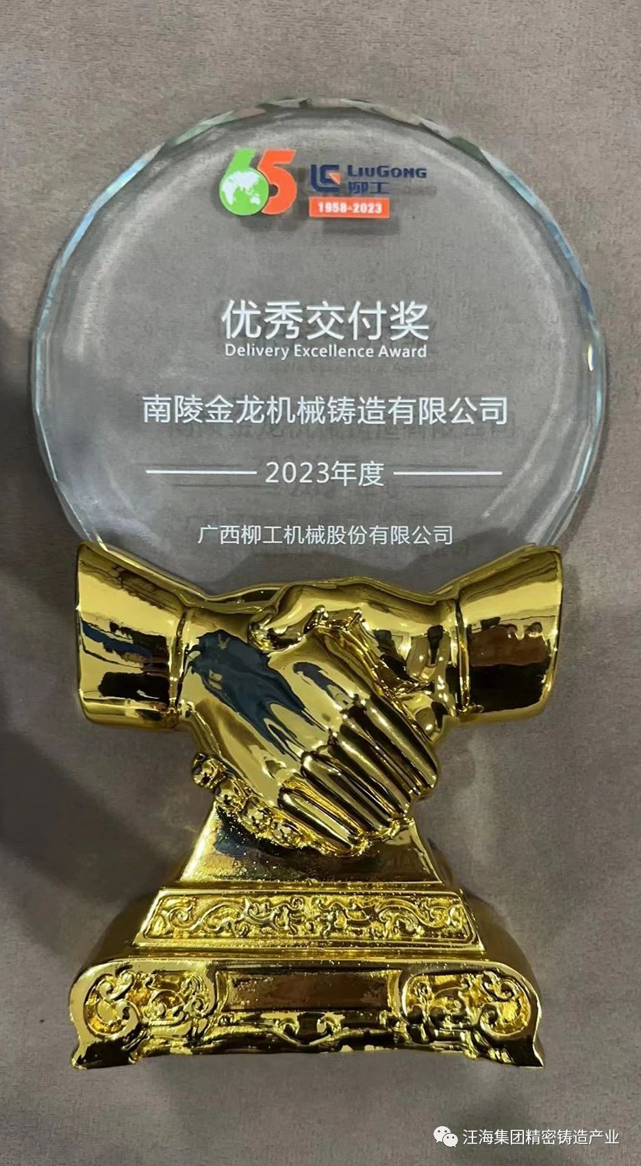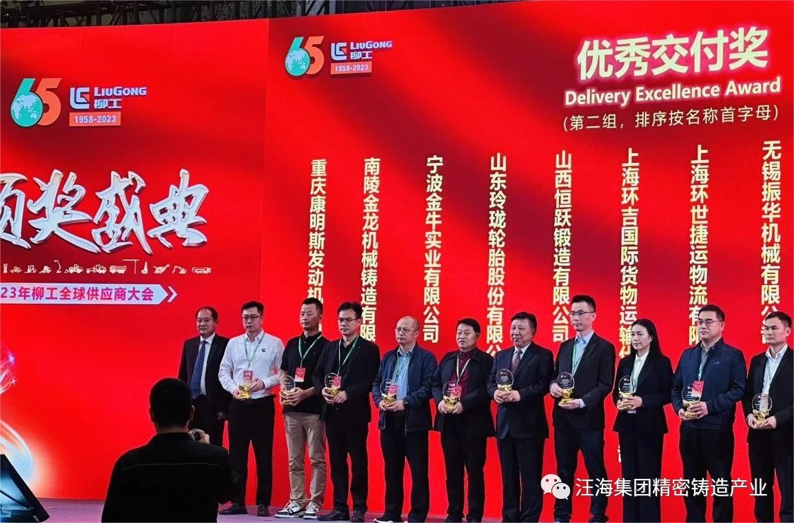 近日,南陵金龙机械铸造有限公司荣获广西柳工机械股份有限公司“优秀交付奖”殊荣。这是柳工为表彰长期以来支持机械制造事业发展的合作伙伴颁发的奖项,是柳工对南陵金龙持续配套服务工作高度认可的体现。汪海集团总经理刘总代表公司上台领奖。